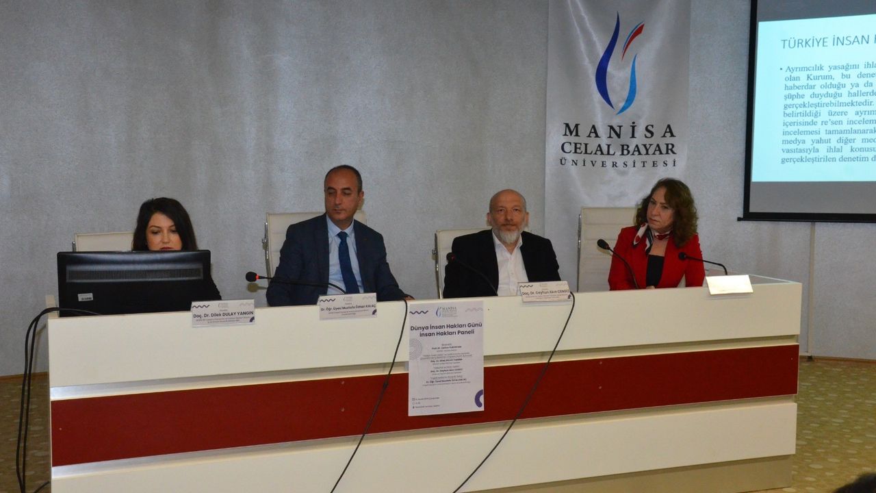 Rektörlük Seminer Salonu’nda yapılan panele üniversite akademisyenleri, öğrenciler ile Manisa Valiliği İl İnsan Hakları Kurulu üyeleri katıldı. Panelin moderatörlüğünü İşletme Fakültesi Dekanı Prof. Dr. Hatice Yurtsever üstlendi. Panelde, İİBF öğretim üyesi Doç. Dr. Dilek Dulay Yangın, İnsan ve Toplum Bilimleri Fakültesi öğretim üyesi Doç. Dr. Ceyhun Akın Cengiz ve MCBÜ Engelli Danışma ve Koordinasyon Birimi Koordinatörü Dr. Öğr. Üyesi Mustafa Özhan Kalaç konuşmacı olarak yer aldı.