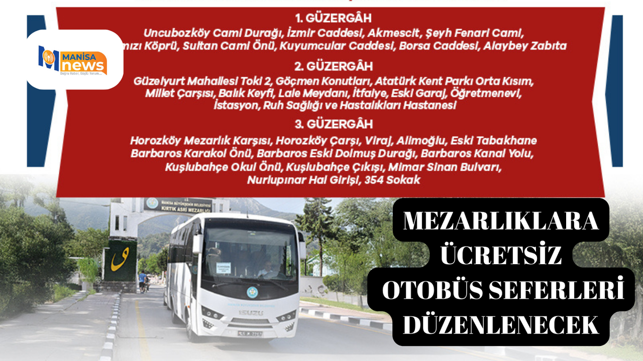 Manisa Büyükşehir Belediyesi, Ramazan Bayramı öncesinde vatandaşların kabristan ziyaretlerini huzur ve kolaylık içinde yapabilmeleri amacıyla ulaşım desteğini bu yıl da sürdürüyor. Arife günü ve bayramın ilk günü uygulanacak hizmet kapsamında, şehir merkezi ve ilçelerde mezarlıklara ücretsiz otobüs seferleri düzenlenecek. Vatandaşların yoğunluk yaşamadan, güvenli ve konforlu bir şekilde mezarlıklara ulaşabilmesi için planlanan seferler, 09.00 ile 17.00 saatleri arasında ring sistemiyle gerçekleştirilecek. Belirlenen güzergâhlarda kesintisiz olarak hizmet verecek araçlar sayesinde, özellikle yaşlı ve ulaşım imkânı kısıtlı vatandaşların ziyaretlerini daha kolay yapmaları sağlanacak.