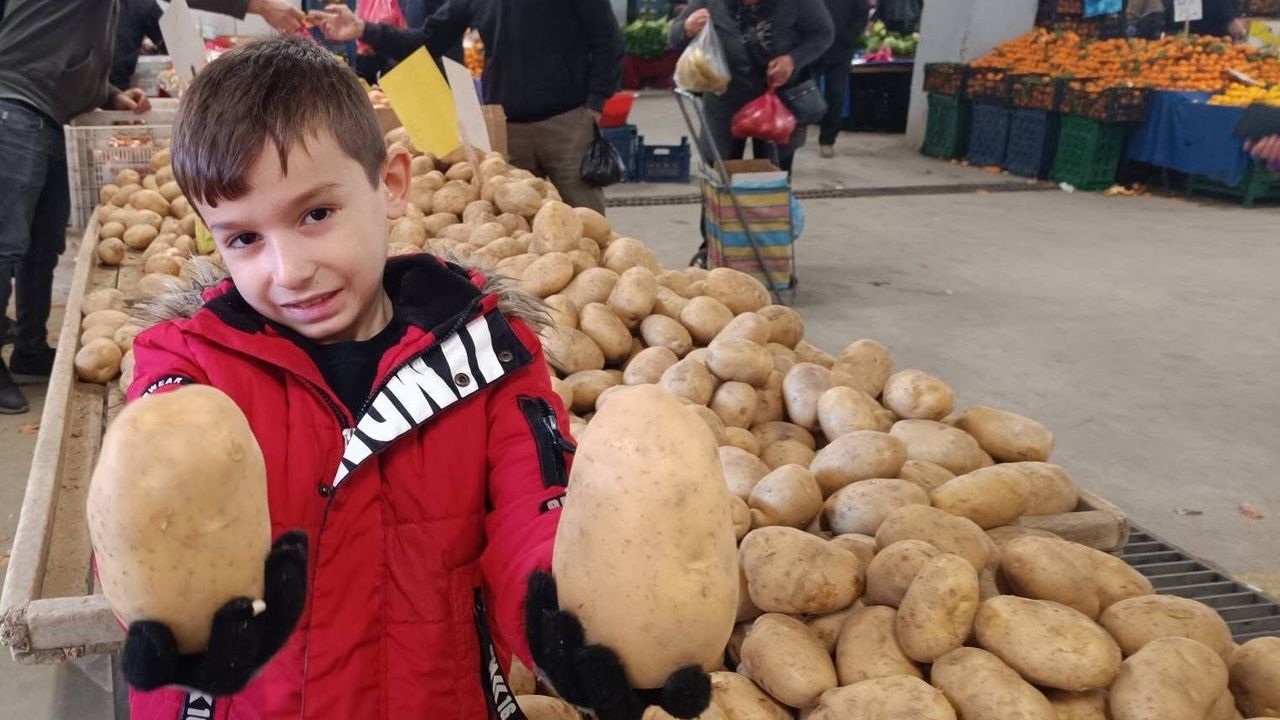 Dev patatesler, çocukların da ilgisini çekti. Anne ve babasından izin alarak tezgaha yaklaşan küçük Yağız Sarıkaya, iki dev patatesi eline alarak fotoğraf çektirmeyi ihmal etmedi.