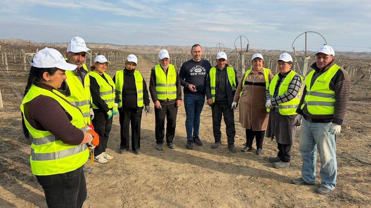 Gürcistan ve Ermenistan sınırına yakın konumda bulunan Ağstafa rayonundaki bin 600 dönümlük alanda yetiştirilen Red Globe, Sultaniye çekirdeksiz ve Merlot cinsi üzüm bağlarında düzenlenen eğitimlerde, Azerbaycanlı kadın ve erkeklerden oluşan 30 kişilik işçi grubuna uygulamalı olarak budama teknikleri anlatıldı.