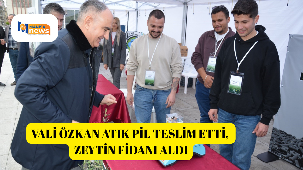 Manisa Büyükşehir Belediyesi tarafından kurulan atık pil toplama standını da ziyaret eden Vali Özkan, biriktirdiği 1 kilogram atık pili teslim ederek kampanya kapsamında zeytin fidanı aldı.